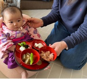 両親など親戚の人たちと自宅で食事をしました。お祝いなので料理などは協力して持ち寄りました。1歳を迎え、祖父母などからは、プレゼントがもらえたりと、誕生日会みたいな感じです。