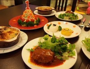 両親など親戚の人たちと自宅で食事をしました。お祝いなので料理などは協力して持ち寄りました。1歳を迎え、祖父母などからは、プレゼントがもらえたりと、誕生日会みたいな感じです。